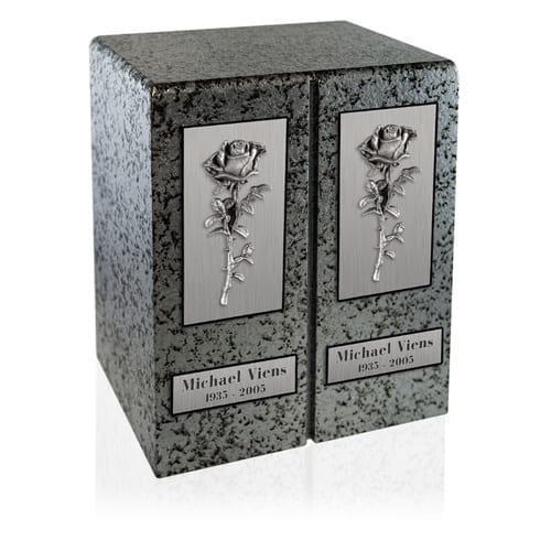 Urne en laiton double de couleur grise argentée ornée, en façade, de 2 roses qui peuvent être substituées par quelques autres motifs. L’espace pour 2 plaquettes d’identification est également prévu.